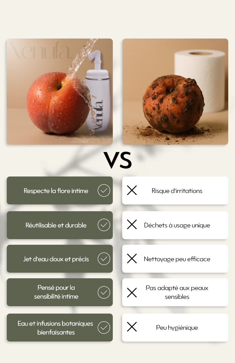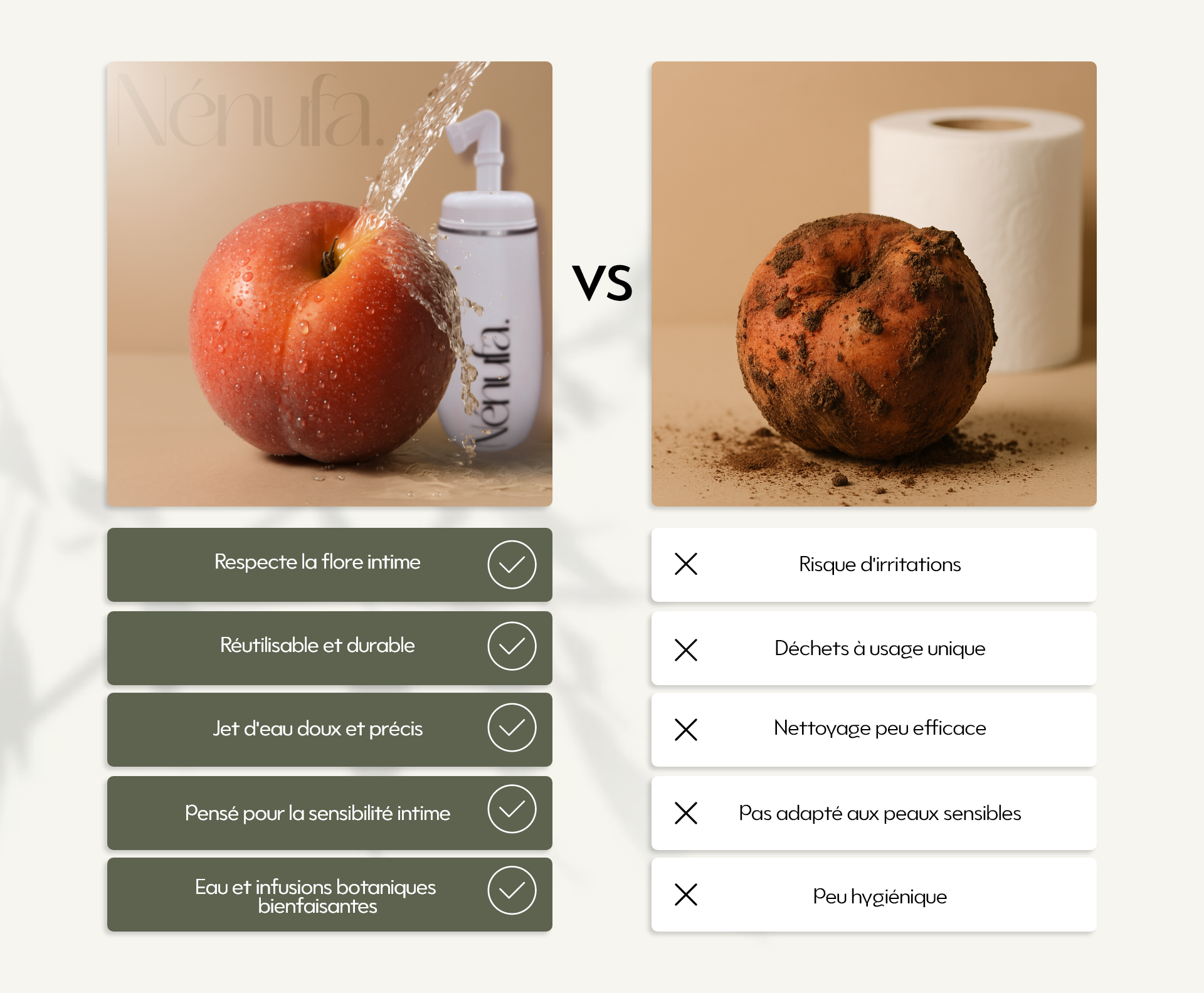 Nénufa vous propose une douchette intime portable, discrète et élégante, accompagnée de ses infusions botaniques conçues pour une hygiène intime naturelle et rafraîchissante. Une solution pensée pour répondre aux besoins d’hygiène optimale de chaque femme, en tout lieu.